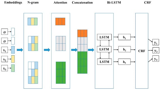 The proposed Att-BiLSTM-CRF model shown in Figure 1 is composed of six building blocks: Embeddings, N-gram, Attention, Concatenation, BiLSTM and CRF layers. The Embeddings Layer converts each input character into an embeddings vector and the N-gram Layer applies n-gram techniques on embeddings to form n-gram embeddings (n from 1 to 3). The Attention Layer employs self-attention on n-gram embeddings and the Concatenation Layer combines the self-attention representations. The BiLSTM Layer captures the features of the previous concatenated results and then the CRF Layer takes the BiLSTM Layer output to decode the tag sequence. The method of n-gram character embeddings and details of the neural entity recognition model will be discussed in the following sections.