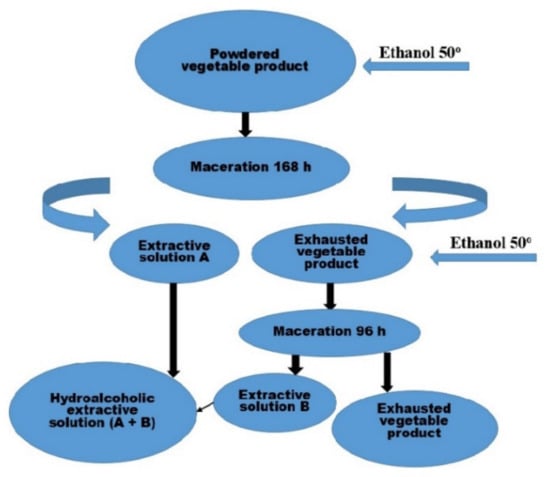 Based on the solubility of the active compounds contained in the studied plant products, 50% ethanol (v/v) as an extraction solvent (named the menstrum) and a 1:10 vegetable product to solvent ratio were chosen. The double maceration method was selected.