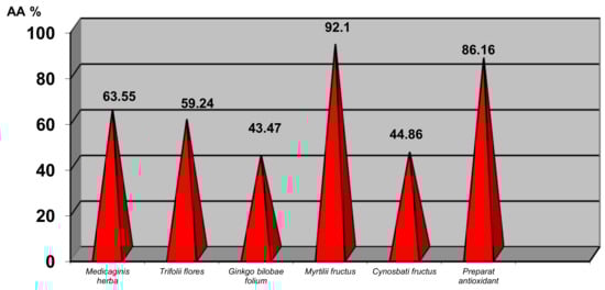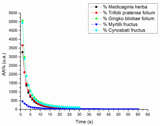 The obtained data were verified by UV-VIS spectrometry, and we observed the changes in the absorption maxima of DPPH from 519 nm. The spectrometric determinations for Myrtilli fructus, Cynosbati fructus, and the antioxidant product, however, were inconclusive since the extracts have absorption maxima in the region of 500–520 nm, which made it difficult to monitor possible changes in the maximum DPPH. In the case of Medicaginis herba, Trifolii pratensae flores, and Ginkgo bilobae folium, to which the method could be applied, the antioxidant capacity was calculated according to Equation (6):