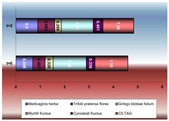 Graphical representation of the antioxidant capacity of hydroalcoholic solutions of Medicaginis herba, Trifolii pratensae flores, Ginkgo bilobae folium, Myrtilli fructus, and Cynosbati fructus and CILTAG.