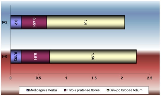 Graphical representation of the antioxidant capacity of hydroalcoholic solutions of Medicaginis herba, Trifolii pratensae flores, and Ginkgo bilobae folium.