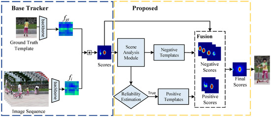 The framework of our approach. The base tracker part is the common framework of Siamese-based trackers. For each frame, the features of the template image and the search image are extracted using a shared-weight network. Then, a score map is generated by the cross-correlation of the two features. To further exploit the information from the score map, we take the scores as a whole and process them using our scene analysis module. The objects with highly similar responses are collected as negative templates. Next, we estimate the tracking reliability leveraging the outcomes of the SAM and collect confident tracking results as positive templates. Finally, the scores of the ground truth, negative, and positive are fused and the tracking box is regressed from the fused score map.