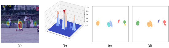 Figure 3a shows a tracking frame and its corresponding responses after cross-correlation. The tracking frames were obtained from the OTB dataset [11]. The backbone was obtained from SiamRPN++ [15]. Figure 3b shows the responses in three dimensions. We can see that with the improvement in training [17] and the [15] network, the responses distribute densely within the potential tracking targets. Therefore, we take the responses as a distribution and first sample it using the accept-reject algorithm. Specifically, given the responding distribution , we select a known probability distribution and a sufficiently large constant m, such that , we have . Then, we repeatably sample from a uniform distribution . If the ith sample satisfies