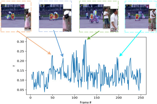 Figure 4 shows the values of over frames on Girl2 of the OTB dataset. When a potential occlusion occurs, presents a peak. We set a threshold parameter . When , it indicates a potential occlusion (see the values in frames 50, 70, 100, 120, etc.); the tracking results are unreliable. Conversely, if satisfies in successive tracking frames, the result is considered reliable.