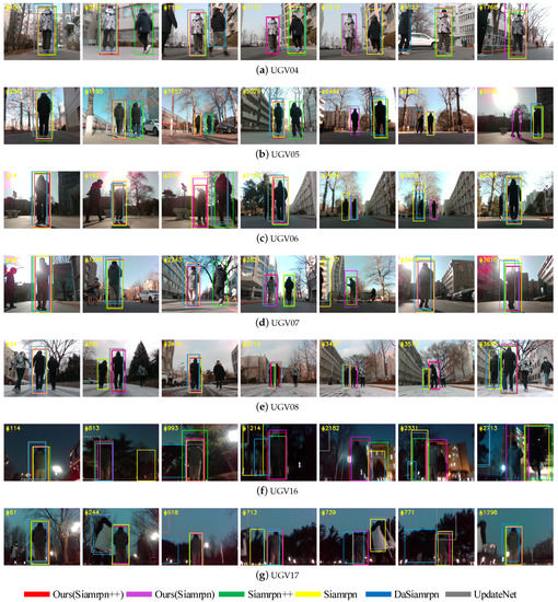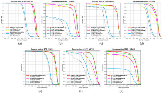 UGV16 (Figure 7i) and UGV17 (Figure 7j) were conducted in the evening (Figure 8f,g); similar to UGV14 and UGV15, the success rates of the other approaches were heavily decayed. Our approach exhibited its strength in these situations, where both AUC score and tracking robustness outperformed the corresponding approaches.