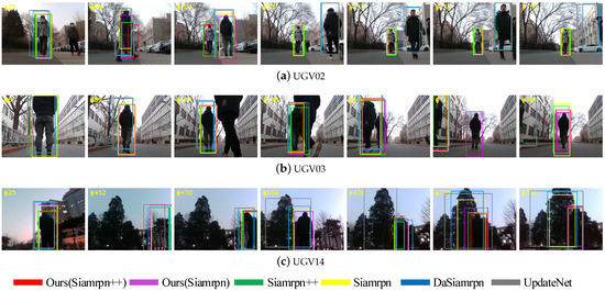 For UGV02 and UGV03, we can see that the tracking boxes usually drift when a distracting person passes through and temporarily occludes the target. For UGV14, the variation in light severely impacts the trackers’ performance. In general, our approach performs well and provides improvements in both AUC scores and robustness.