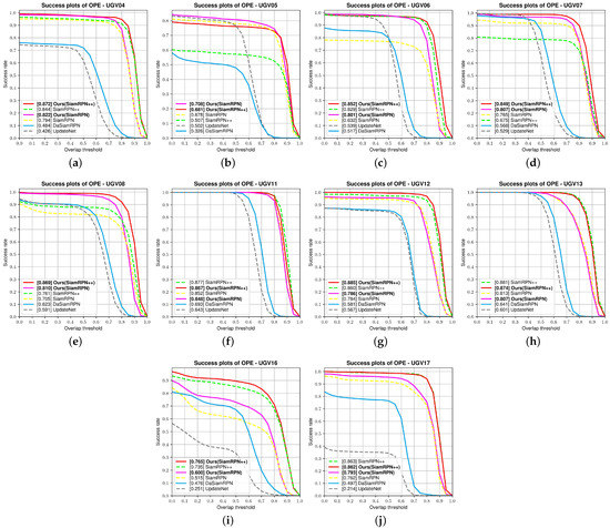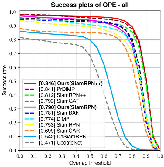 We additionally compare our approaches with several latest state-of-the-art approaches: SiamCAR [19], SiamGAT [21], SiamBAN [20], DiMP [30], and PrDiMP [31]. The overall success plot of the dataset is depicted in Figure 9.