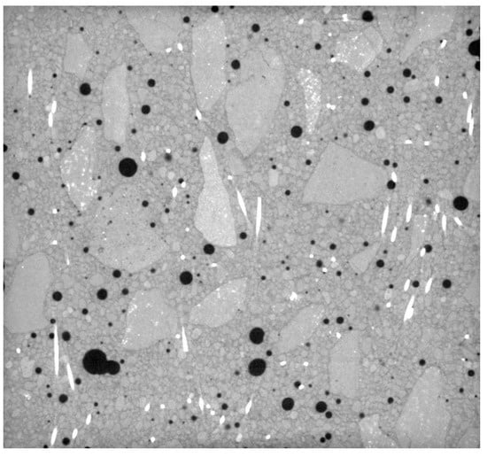 Fibers can only be found in fiber-reinforced concretes. However, pores are present in all concretes. In most cases, this is an unintended “component”; nevertheless, there are other situations where concretes are designed with a certain level of porosity. This occurs, for example, in pervious concretes used mainly in concrete pavements [18,19,20] or in porous concretes to improve their response to freeze–thaw cycles [21,22,23].