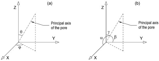 Regarding pore orientation, it is obtained from AVIZO in Spherical coordinates; that is, the angular information it provides are the values of θ (theta) and ϕ (phi) (Figure 6a). Theta is the polar angle, i.e., the angle between the principal axis of the pore (the one containing its length) and the vertical Z axis. It should be noted that the vertical axis corresponds to the concreting direction and also to the loading direction. Phi is the azimuthal angle, i.e., the angle between the projection of the principal axis on the XY plane and the X axis. Theta varies from 0° to 90° while phi varies from −90° to 90°.
