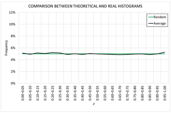 However, the average distribution histogram is almost coincident with the theoretical value corresponding to a uniform distribution. This means that, at a larger scale, this intrinsic dispersion disappears. The fact that the specimens have been cut from the inside of a prism means that the edge effect does not exist.