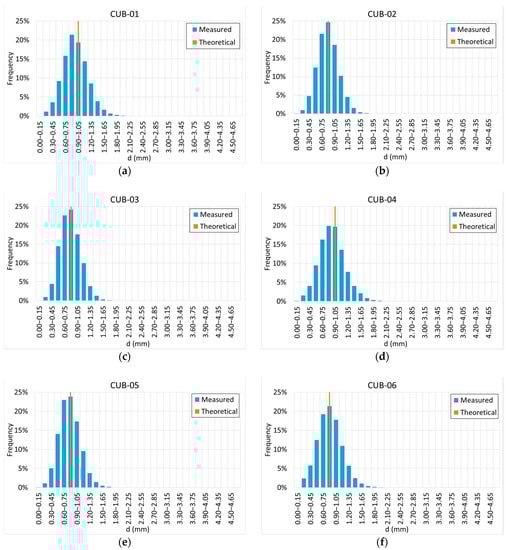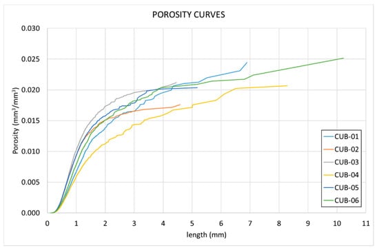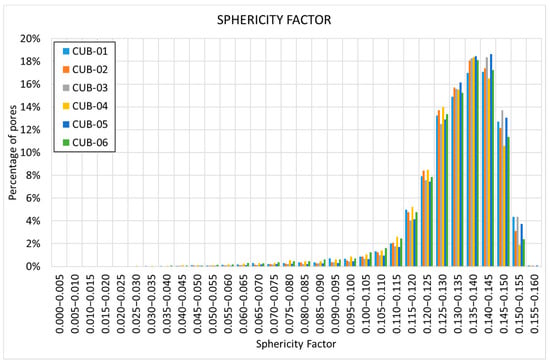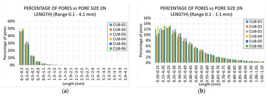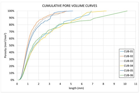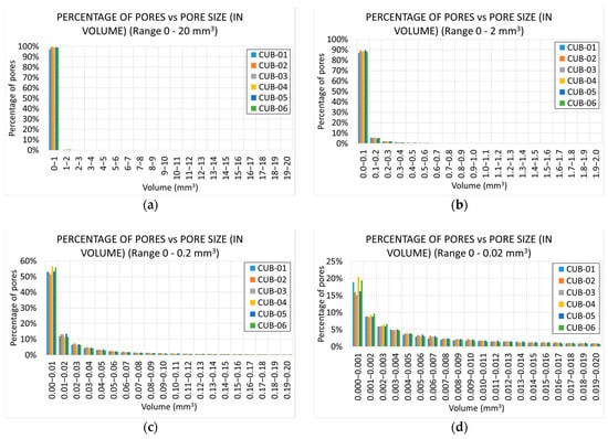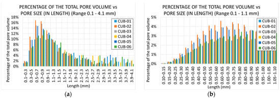 Figure 14 shows how, in this case, there is dispersion in the pore distribution. In particular, specimens CUB-04 and CUB-06 show a higher percentage of pores in the lower region. Specimen CUB-04 presents more pores in the range , and specimen CUB-06 in the range .