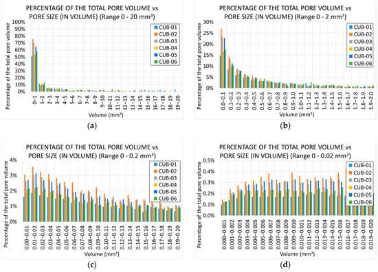 Histograms of pore-volume distribution (in volume) for different ranges, from the largest to the smallest (a–d).