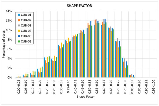 Both the sphericity factor and the shape factor are parameters that indicate the degree of roundness of the pores, where larger values correspond to pores closer to a sphere and smaller values to pores that are less round.