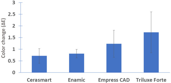 Relative values of , , corresponded to differences before and after immersion. Color differences were classified as follows: > 1 the color change can be detected visually, but is acceptable; > 3.3 the color changes are clinically unacceptable [43] and < 1 are considered undetectable color changes to the human eye [44].