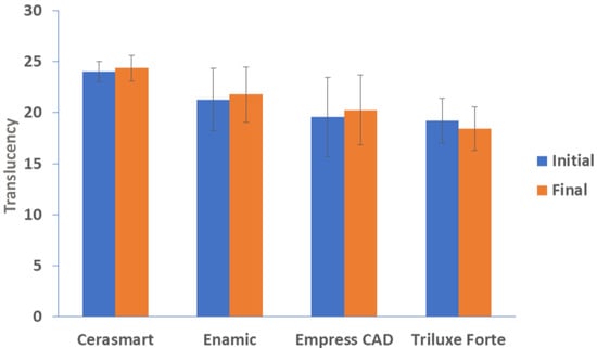 The translucency parameters of the disks did not suffer any drastic changes after 18 h of immersion, for any of the tested materials, as can be seen in Figure 2.