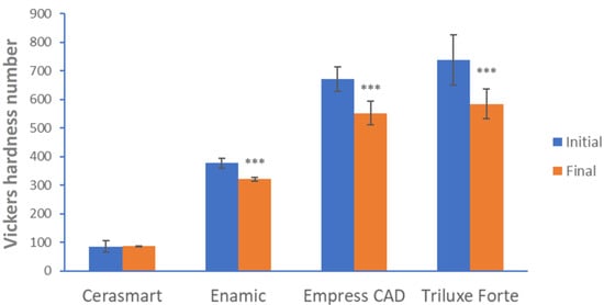 Regarding microhardness investigations, there was a significant decrease in the tested CAD-CAM monolithic materials, except for Cerasmart, which retained the same parameters. The monolithic material that suffered the largest change in terms of microhardness was Triluxe Forte, as can be observed in Figure 3.