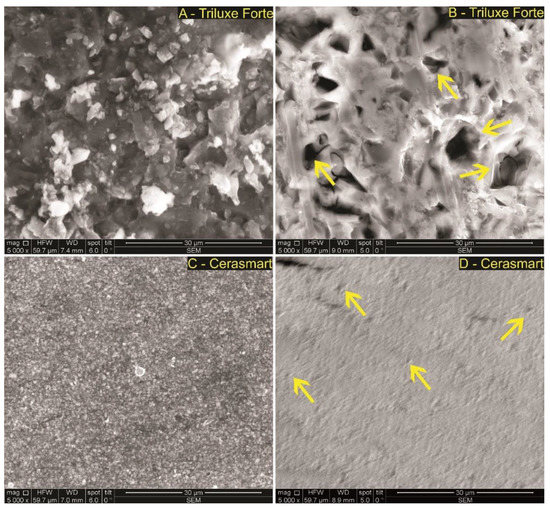 SEM images of Triluxe Forte and Cerasmart ((A,C)—before and (B,D)—after exposure to simulated gastric acid solution) at 5000× magnification and a 99.7 µm horizontal field width. The yellow arrows represent changes that occurred after simulated gastric acid exposure. The non-exposed samples to simulated gastric acid solution exhibited a micro-roughness surface (C) and an increased roughness in sample (A). The exposed samples to simulated gastric acid solution (B,D) presented a clear surface with a polished aspect with obvious pores indicated by yellow arrows (B) and a lack of micro-roughness surface aspect with a few pores indicated also by yellow arrows (D).