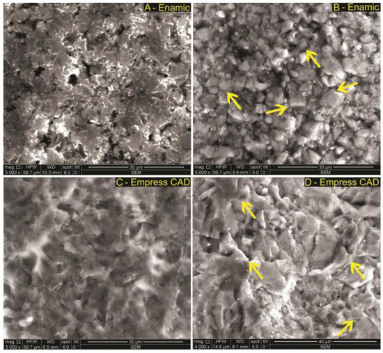 In Figure 5, SEM images of Enamic and Empress monolithic materials are shown. The non-exposed samples to simulated gastric acid solution exhibited a rough surface lacking in sharpness (Figure 5A and the presence of a slight surface matrix appearance (Figure 5C). The exposed samples to simulated gastric acid solution (Figure 5B,D) presented, in both samples, surfaces that were rough and obvious, the surface structures were sharp compared to the control samples (non-exposed), and are highlighted by yellow arrows.
