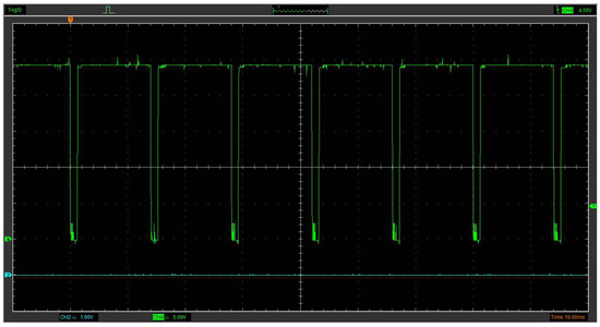 The authors of this paper proposed a new interface, the Device Lightweight Network (DLN). DLN allows us to use only one pair of cables to transfer data and power. However, the goal is to implement an auto-addressing functionality. The first version of DLN was characterized by the following parameters: data link up to 2 Mbps, power link up to 48 V and 10 A. The data are transferred during small breaks in power delivery. To avoid electromagnetic interference (EMI), data are transferred on a low voltage (about 2 V) and power on a much higher voltage (9–48 V), as in the example in Figure 2 with a 24 V power supply. Power and data delivery time can be adjusted depending on whether a higher data rate or more power is expected. Figure 2 shows an example of transferring high power (1.2 ms for data, 12.8 ms for power in each period) due to the supply for high-power lamps, an electric heater and two electric motors (Figure 1).