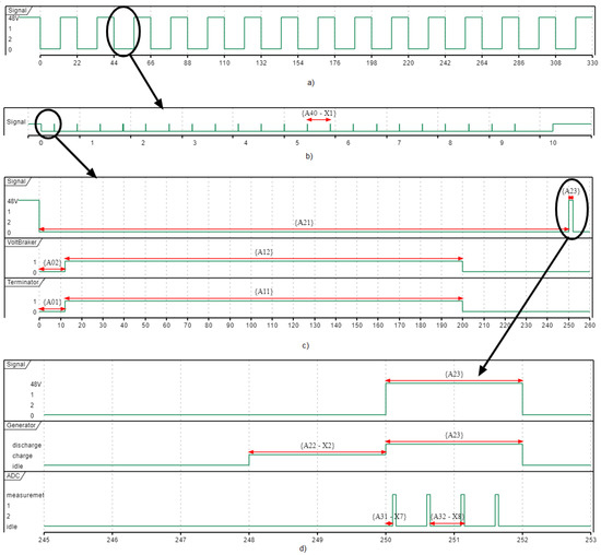 Every test contains 15 repeats (for each node—Figure 3a), every repeat contains 25 measure cycles (Figure 3b). Each cycle is based on sending an energy pulse to the line (Figure 4). Most of the parameters were initially programmed to allow change in value during operation. All signals that can influence the possibility of auto-addressing were connected with algorithm solvers to optimize their value. Figure 4 shows how a generator for injecting disturbance was constructed. Variable X2(A22) defines time in s to charge capacitor C0; a higher time denotes more energy. Variable defines which pulse coil will be used to inject the signal. Time to discharge the capacitor C0 through the coil is constant (A23). Switches S1–S8 are close during the whole cycle (Figure 3b, elements C0–C24).