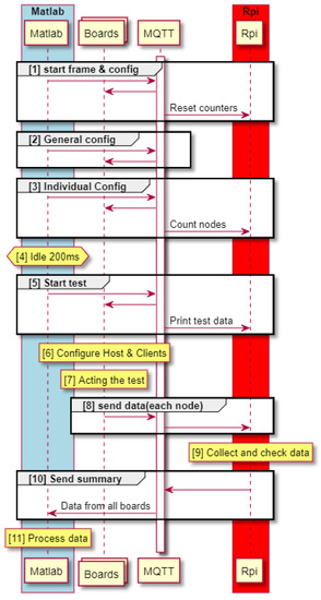 The authors prepared a special program in the MATLAB environment, which received input data of 15 variables, where artificial algorithms (AA) try to find optimal values and many static values, such as strictly hardware dependent parameters, or the component cost of LC terminators. The communication between all components of the stand is shown in Figure 6. The MATLAB environment code is responsible for building up MQTT frames. All frames are sent to boards and Rpi. Client boards after receiving frames with an individual configuration (Figure 6 frame 3) are set to wait for a trigger from the master. To avoid any problems with synchronization, the software waits 200 ms (Figure 6 p. 4) before the data publish the start of the test frame (Figure 6 frame 5). After the test, the boards publish the measured data, which are collected by Rpi to one frame (Figure 6 frame 9), which is published by Rpi, and subscribed by the MATLAB environment (Figure 6 frame 10).