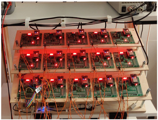 The next step was to build up a research stand for 15 boards and find parameters of auto-addressing, which finally was even more difficult than the authors expected. Unfortunately, the stability of AP on Rpi was unsatisfactory when all 15 nodes sent the report after the test (exactly at the same time). The report contains 1500 measured parameters. The behaviour was diagnosed by MQTT.fx—external tool. It necessitated the use of additional AP, where the Mikrotik RouterBoard was selected, then all frames could be received by the computer with the MQTT.fx and MATLAB environment installed in it. The last issue the authors had to tackle was the MQTT library written in Java for the MATLAB environment because it lacked speed to process all frames from MQTT. The standard solution is to increase Quality Of Service (QOS) in MQTT frames. The disadvantage of this solution is, however, the extended time of sending each measurement. Therefore, in the case of planned 500 k–1 mln tests, another solution was selected. A two-thread script was written in Python, and ran on Rpi. One thread handled receiving and decoding MQTT frames from the JSON format, the other one analysed data, and after the finished test, it collected all data into one frame which was then sent to Matlab. This configuration made the research stand and data flow concept more complicated, but significantly reduced the time of a single measurement, and guaranteed almost 100% data correctness. The only programmed delay (Figure 6, p. 4) was to synchronize all nodes.