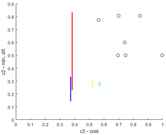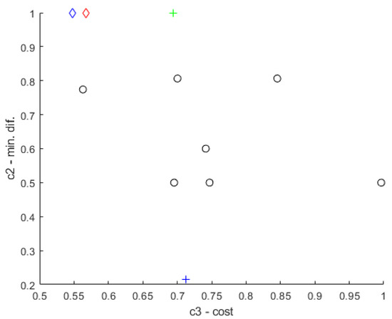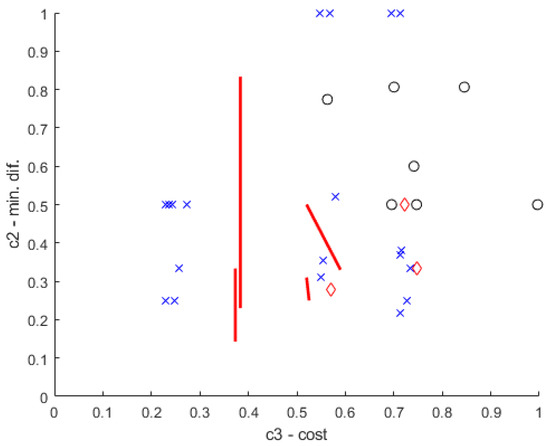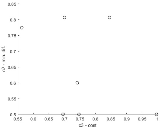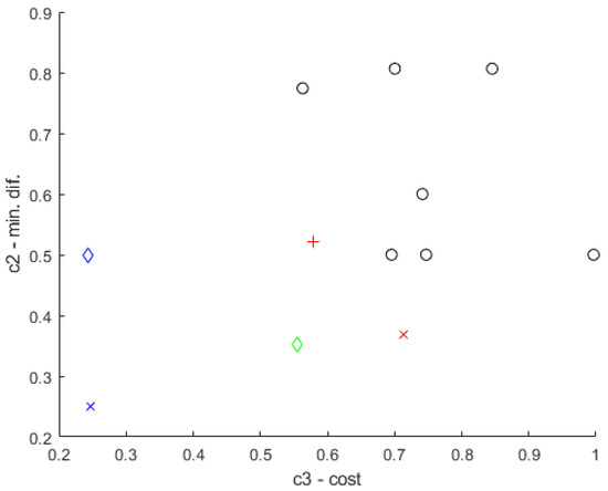 It is clearly visible that LHS usually gives us the worst results, but in the case of using bad algorithm configurations, LHS can deliver better results. As for the results, on the upper diagrams, the authors mark 19 results—the best from each algorithm configuration. In Figure 16 and Figure 17, “x” can be found in the bottom-left corner and two solutions are visible; they are the best results from all tests that the authors conducted. Comparing these two points and all other points (not shown in the figures) from these two configurations, the authors noted that only one decision variable was not the same in all cases.