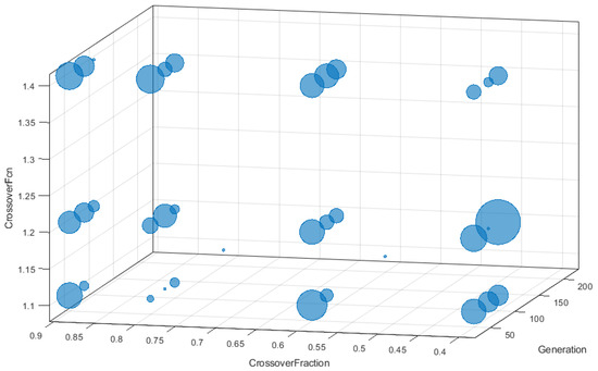 The initial population is generated using the normal distribution. The fitness value of an individual is computed using the objective function (2) or (10). The best fitness value for a population is the smallest fitness value for every individual in the population. Stochastic uniform is applied to choose parents for the next generation, whereas succession operations are realized by defining the reproduction rules characterized by two parameters: elite count () and crossover fraction (). The first parameter is the number of individuals with the best fitness values in the current generation that are guaranteed to survive to the next generation. The second one is the fraction of individuals in the next generation, other than elite children, that are created by crossover. It is decided to use a simple heuristic crossover operator. On the basis of two individuals, and , in the case of , then the new one is created according to the formula mentioned below