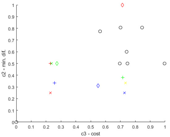 Due to the single objective optimization of Particle Swarm Optimization, the authors cannot mark the best results as being ahed of optimal solutions. PSO was reduced to criteria, according to the pattern Equation (10), where is the inverse of the number of addresses where each one is a (physical) higher (or lower—depending on algorithm) address. There are 14 clients online, meaning 13 areas nodes. If fewer addresses will be correct, variable will be characterized by a higher value. “C” is the cost of the current solution, is the minimal difference between addresses. Figure 18 represents alternative solutions of PSO algorithms. Shape and colour codes were shown in Table 8. As one can see, higher population size means better results, but even in the smallest population there was one result with close to 0.2 (according to Equation (8) has the higher weight). Decision parameter should have a minimum value of 0.5, which was achieved only two times at a particle size of 50, four times at a particle size of 100 and nine times at a particle size of 200, which led the authors to the conclusion that the number of correct solutions is growing proportionally to population size. Based on Table 8, if the minimum neighbours fraction is set to 3.5, the chances of finding a multiple solution are poor; based on this, the maximum correct solution in the current approach will be nine, which translates into the conclusion that a population at a particle size of 200 is optimal for the correct solution.