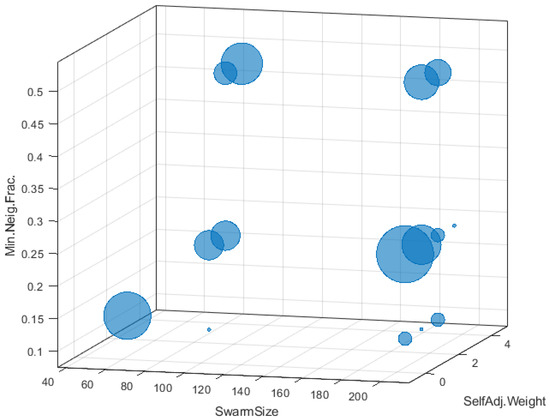 For analysing the quantitative results of PSO, Figure 18 was created. The size of the bubble represents the quantity of correct results. We can see that setting the optimal value is more important in PSO than in GA. As with GA, a bigger population is better. The authors obtained 51 correct solutions during those tests in which population size = 200. In future research, the best population should be tested. Parameters such as minimal neighbour fraction and self adjustment weight have been well estimated due to the biggest results in the middle of the parameters’ spectrum. The full comparison of parameters’ influence on the number of results is visible in Table 8.