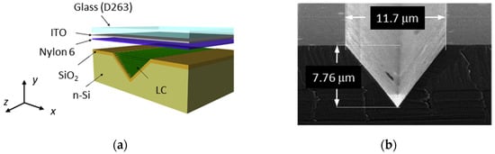 Optical waveguide made of LC infiltrated in a SiO2/Si V-groove: (a) Three-dimensional exploded schematic, showing the orientation of the nematic LC molecules along the V-groove; (b) Electron microscope scanning of a SiO2/Si V-groove.
