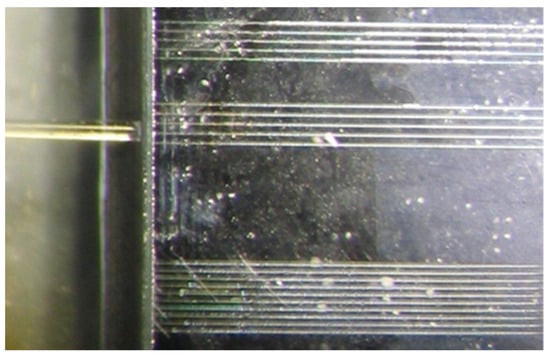 Picture of a single-mode optical fiber which is butt-coupled to a chip, including a set of LC waveguides on SiO2/Si grooves. Waveguide width is 8–12 µm.