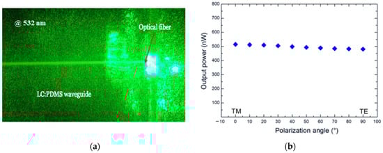 Propagation properties of an LC:PDMS waveguide with a width of 15 µm: (a) green laser light (wavelength = 532 nm) beam butt−coupled by using a single mode optical fiber of 125 µm; (b) output power versus polarization at a wavelength of 1550 nm.