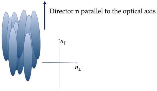 Light propagation in LC waveguides is affected by the LC molecular orientation represented by a unity vector referred to as director n, as shown in Figure 8. Typical dimensions are a few nanometres along the molecular axis and about 1 nm in the perpendicular direction. Locally, a refractive index n‖ along the molecular axis and a refractive index n⊥ perpendicular to the molecular axis are defined. In the bulk LC, an extraordinary refractive index ne and an ordinary refractive index no are defined along and perpendicularly to the director n, respectively, showing a birefringence ranging between 0.15 and 0.5, depending on the chemical compounds and wavelengths.