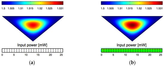 Computed all-optical dependence of the refractive index distribution in a SiO2/Si LCW with upper width of 10 µm: (a) without input optical signal; (b) with input optical signal.