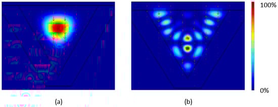 After computing the refractive index distribution, the beam propagation method can be used to simulate light propagation in LC waveguides, allowing design of photonic devices [58,59,60]. Figure 10 shows a typical contour map of the fundamental mode (Figure 10a) and a higher order mode (Figure 10b), evaluated at a wavelength of 1550 nm in a 10 µm wide LCW with an applied voltage of 10 V for which 35 modes were found.