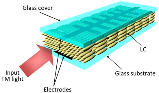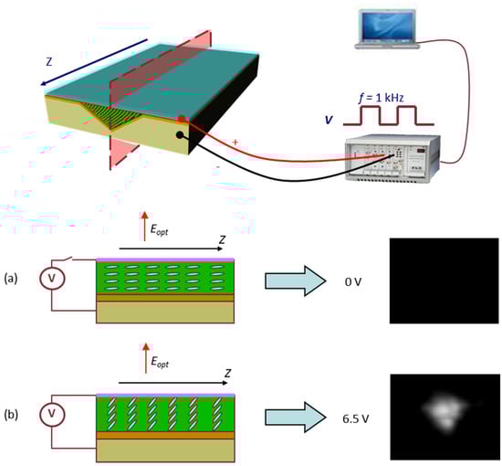 The configuration of the Bragg reflector device based on top–bottom electrodes to obtain an electro-optic distributed feedback waveguide (DFBW) with full adjustability of confinement and Bragg resonance wavelength is shown in Figure 17 [66]. It consists of a planar glass cell with a nematic LC layer and a top–bottom configuration of transparent electrodes allowing an external voltage application. LC molecules are arranged with a planar alignment with the director n parallel to the propagation direction. Two-dimensional optical confinement of propagating transverse-magnetic TM light polarization is ensured through a graded-index channel by a suitable voltage applied between the comb-shaped top electrode periodic along the propagation direction and the ground plane at the opposite boundary.