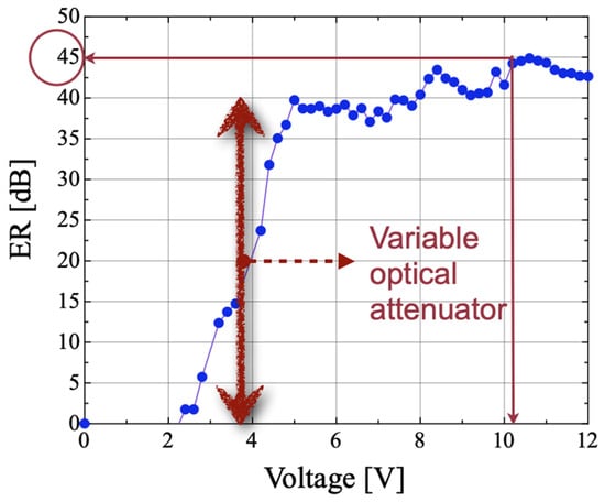 If voltage is not applied, the polarized light beam comes across the ordinary refractive index no of the LC, which is lower than the glass refractive index, as shown in Figure 11a. When a voltage is applied, the LC molecules are mostly reoriented perpendicularly to the propagation direction and to the glass plates, and confined light propagates in the LC core, as shown in Figure 11b. In fact, as shown in Figure 12, when a voltage is higher than just 2 V, light starts to propagate, and transmission increases with an on-off extinction ratio (ER) above 40 dB at a voltage of about 8 V, with ER defined as: