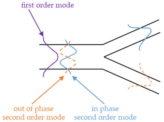 Image of the field distribution due to two superimposed TM guided modes in a 1 × 2 optical switch encompassing an output Y-junction.