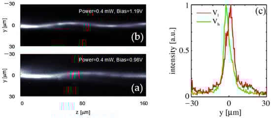 A near infrared switching and signal routing at the wavelength of 1064 nm with a positive uniaxial nematic LC 5CB has been experimentally demonstrated, with modulations of 210 mV for a device length of 160 μm. The balanced superposition of TM00 and TM01 modes has been excited with a 0.4 mW power beam focused on the waveguide facet. The tilt and offset with respect to the channel axis was carefully adjusted using a 10× microscope. The propagating modes gain a relative phase Δϕ = 2π after 160 μm, and the output intensity peaks on the same side of the excitation when a bias of Vl = 0.98 V is set, as reported in Figure 15a,b, which shows a clear switching for V = Vh = 1.19 V. Finally, the transverse intensity profiles acquired in z = L for the two previous cases, reported in Figure 15c, highlight the substantial lateral shift achieved, with a modulation ΔV = 210 mV in 0.16 mm.