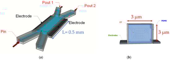 An optical switch based on the same principle as the previous device has been designed by using a zero-gap directional coupler based on LC:PDMS technology [63]. The coupling condition depends on LC refractive index controlled by in-plane voltage applied to coplanar electrodes. Figure 16a shows the top view of the device, in which two-input single mode optical waveguides are brought together at zero distance between them to form a two-mode region. The 3 µm × 3 µm square cross-section of the bimodal region is reported in Figure 16b, in which coupling occurs because of the interference between the two modes propagating controlled by a voltage applied to coplanar electrodes. Light can be switched to either of the two output waveguides with an extinction ratio higher than 16 dB over a coupling length of 0.5 mm; an applied voltage of just 1.62 V is required to route light to the right-hand output waveguide (Pout 2), while 1.76 V are needed to route light to the left-hand output waveguide (Pout 1). The coupler can also be designed to behave as a demultiplexer for wavelengths 980 nm and 1550 nm by separating them into the two different output ports with a contrast better than 10 dB. Coplanar gold electrodes are used and consist of gold thin films deposited by electroplating, which can switch LC in a PDMS channel by applying only 2.85 V.