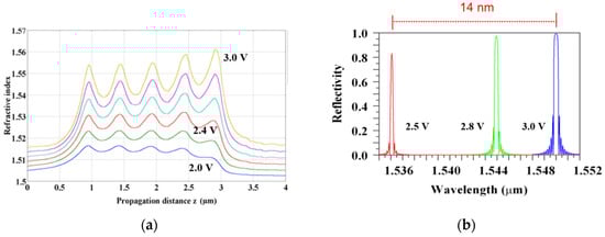 Tuning characteristics of the nematic LC tunable Bragg reflector with top–bottom electrode configuration: (a) refractive index profile modulation along propagation direction for applied voltages between 2 V (bottom line) and 3 V (top line) in 0.2 V steps; (b) normalized grating reflectivity for 2.5 V (red), 2.8 V (green) and 3 V (blue). Reprinted with permission from Ref. [66]. Copyright 2009 OSA.
