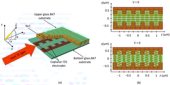 Tunable Bragg reflector with coplanar electrode configuration and planarly anchored nematic LC: (a) three-dimensional view; (b) molecular orientation above the electrodes without (V = 0) and with (V > 0) applied electric field.