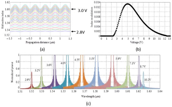 Modulation of the refractive index 100 nm below the top electrode experienced by the TM00 mode versus propagation distance or applied voltages from 2 to 3 V (in 0.2 V steps) is reported in Figure 18a. As reported in Figure 18b, a wavelength tuning of 14 nm (1536–1550 nm) is achievable with applied voltages ranging from 2.5 V to 3 V (further details on technology parameters can be found in ref [66]).