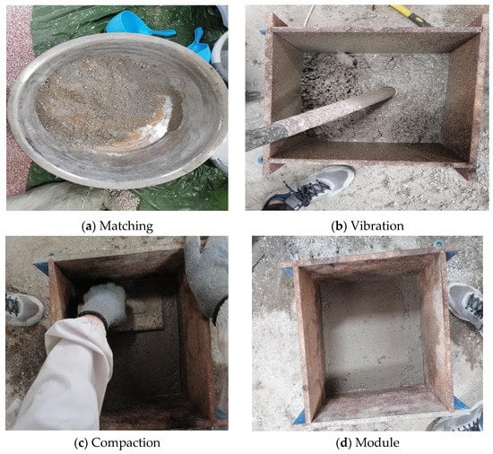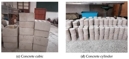 To ensure concrete specimens meet the requirements of the experiment and the relevant documents and regulations in China, production equipment, including an electronic scale, concrete vibrator, concrete mixer, mold, shovel, mud knife, and sprinkling, were used in the specimen preparation process.