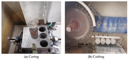 The cutting machine used in this cutting was a SCQ-300 automatic cutting machine as shown in Figure 3b, the saw blade adopted a diamond blade, and the cutting speed was 5 mm/min. Figure 3c,d show the concrete cubic after coring and the concrete cylinders, respectively.