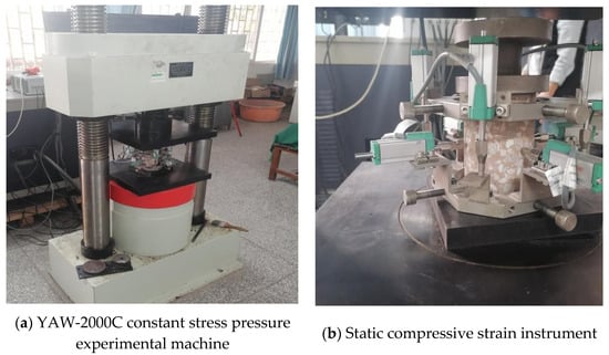 The uniaxial compression experiment was carried out on the YAW-2000C constant stress pressure experimental machine, as shown in Figure 4a. The maximum experimental force was 2000 kN, the experimental force range was 0~2000 kN, the rated voltage was 380 V/220 V, and the motor power was 1.5 KW. The working environment temperature was 10~35 °C, and there was no vibration, no corrosive media, and no magnetic field interference in the working environment. The strain instrument adopted is shown in Figure 4b, with a measuring accuracy of 0.01 mm.