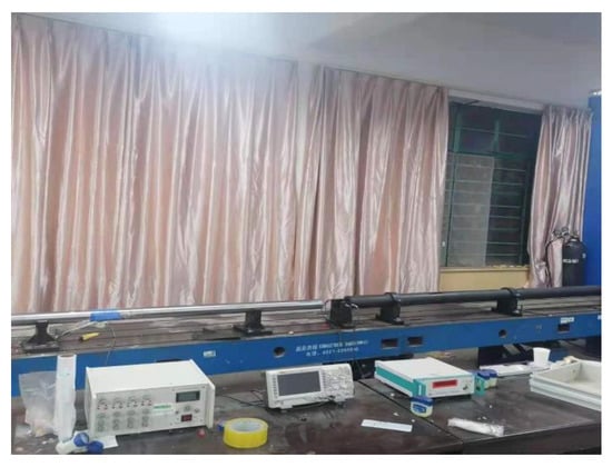 The dynamic compressive experiment used the Split-Hopkinson pressure bar (SHPB) of the Laboratory of Kunming University of Science and Technology. The Split-Hopkinson pressure bar system was shown in Figure 5. The diameter of the SHPB is 75 mm. The length of the incident bar and transmitted bar is 2 m, the density is 7795 kg/m3, the elastic modulus is 210 GPa, the Poisson’s ratio is 0.286, the loading rate is 0~50 m/s, and the accuracy is 0.1 m/s. The bullet is spindle shaped. The strain gauge is attached to the center of the bar, and the distance from the incident bar and the transmission bar is consistent. At the same time, it is equipped with a strain gauge, oscilloscope, and tachometer.