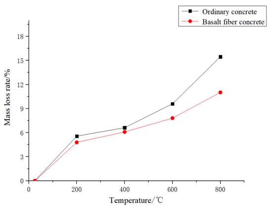 As shown in Table 3 and Table 4, the density of basalt fiber-reinforced concrete is higher than ordinary concrete. In addition, as can be seen in Figure 8, although the overall mass loss rate declined, the mass loss rate of basalt fiber-reinforced concrete was lower at every temperature compared with ordinary concrete.