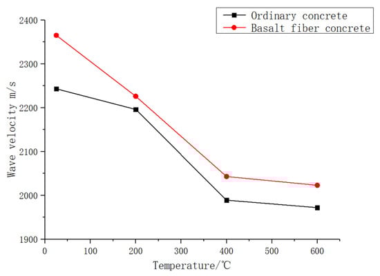 Figure 9 shows, at the same temperature, that the wave velocity of basalt fiber-reinforced concrete is higher than ordinary concrete. Here, the compactness of basalt fiber-reinforced concrete is better than ordinary concrete and the effect of the high temperature on the basalt fiber-reinforced concrete is more slight than ordinary concrete.